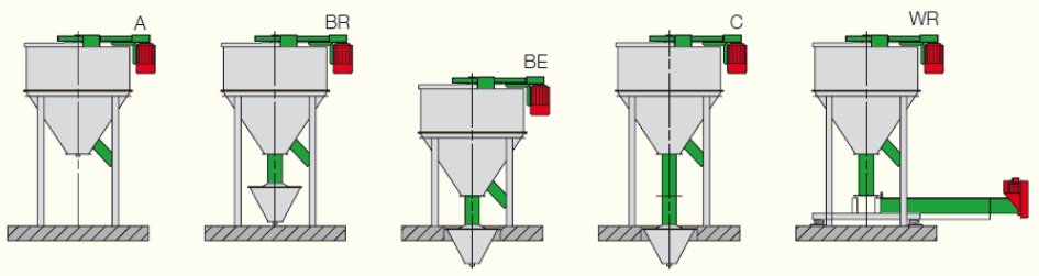 Смесителите на Buschhoff се предлагат с различен дизайн и техническо изпълнение. Биват 5 типа – А, BE, BR, C и WR. Тяхната вместимост е от 750 до 3000 kg. Работят на принципа на добре изпитания в практиката процес на принудително смесване и достигат точност на смесване 1: 100 000. Големият (бавно връщащ се) шнек осигурява ефективно и бързо смесване. Без проблем могат да се добавят до 5% мазнини. Друго предимство на смесителите от типа WR е, че те могат да бъдат снабдени с приемащ шнек, с дължина до 4м. Благодарение на това е възможно безпрахово подаване на компонентите.