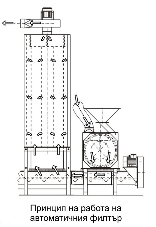 При работа с фуражомелка без вентилатор препоръчваме използването на автоматичен филтър. Автоматичният филтър се монтира над коритообразния конвейер, пренасящ смляното зърно от дробилката към миксера. Вентилаторът на филтъра изтегля въздуха, създавайки подналягане в цялата система. Въздухът, идващ от коритообразния конвейер, минава през филтърните ракави, които задържат праха в корпуса и излиза навън чист. През определени интервали от време компютърът спира вентилатора за 20 сек. и включва вибратор, които събаря праха от ръкавите обратно в шнека, след което вентилаторът отново се включва.