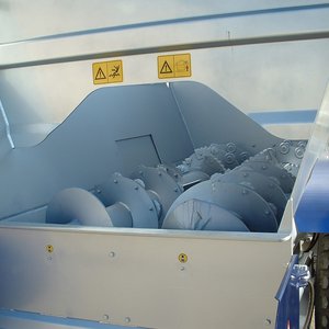 Фуражораздаващ миксер, оборудван с 2 хоризонтални разбъркващи шнека – без зареждаща фреза. Трансмисия на шнековете, потопена в маслена баня. Стандартен изпускателен отвор, монтиран в средата на дясната страна, с шибър. Заден отвор за товарене на насипни материали. PTO вал, калници, дъно с дебелина 10 mm, без хидравлика. Отговаря на европейските норми.