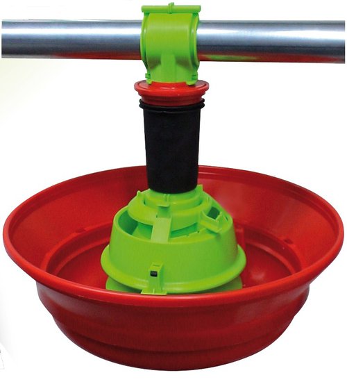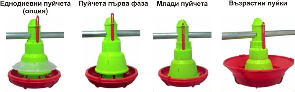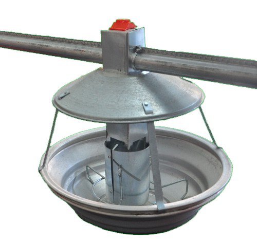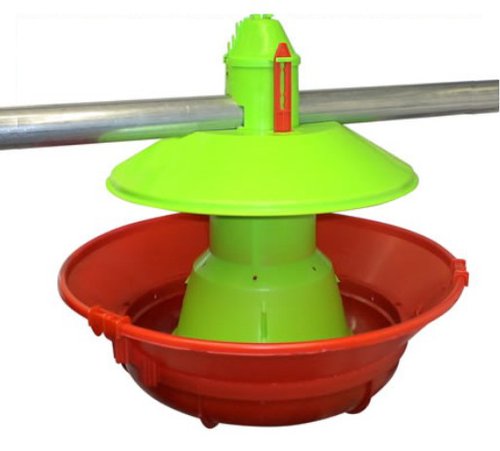 Здравa хранилка, която е лесна за ползване. Регулирането е централизирано или ръчно. Предлага се за тръби 45 и 48 мм. Висококачествен продукт на конкурентни цени. Тавичката се сваля лесно за почистване. Лесно и бързо монтиране и демонтиране на предпазния пръстен при преминаване от първа към втора фаза на хранене, без инструменти. против Влизането на пуйчета в хранилката се предотвратява посредством прозрачен пръстен, позволяващ добра видимост и лесно следене на нивото на фуража. Подложката може да се завърти около тръбата, напречно, за самозаключване. (само 20 сантиметра от общата височина).