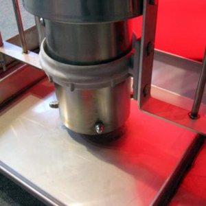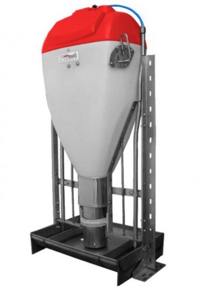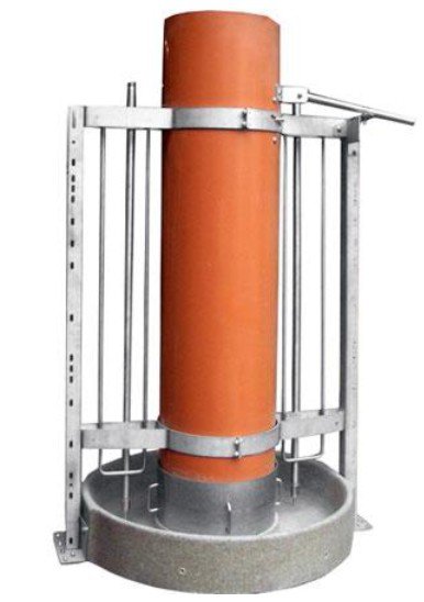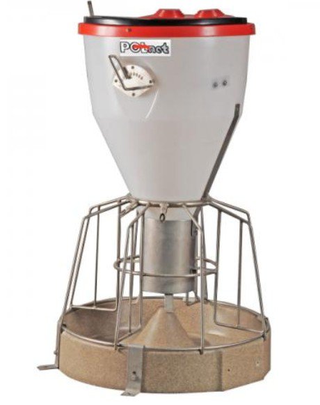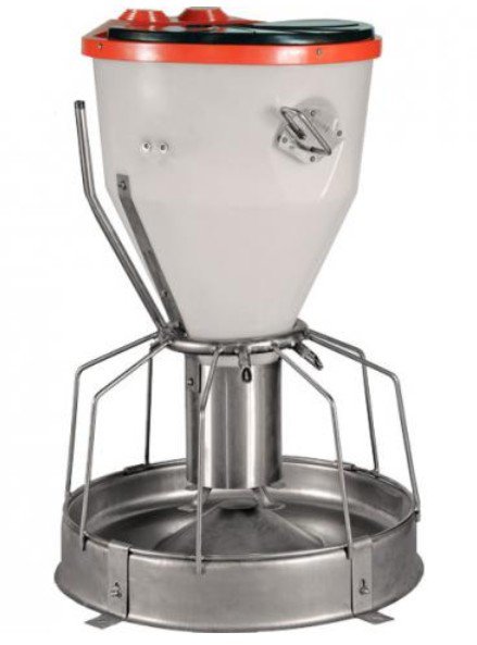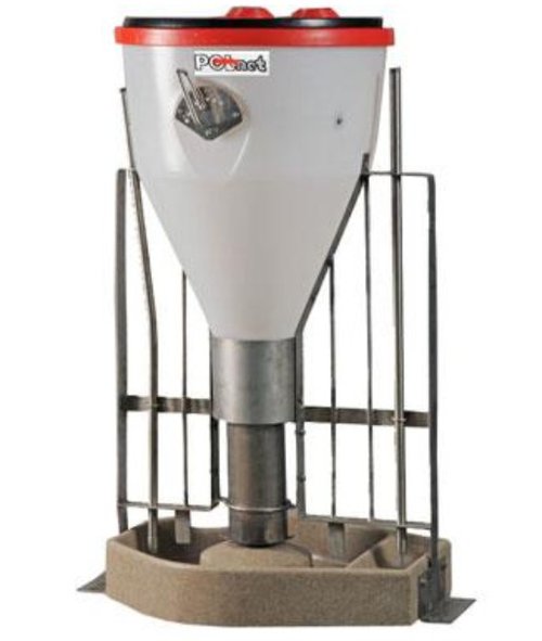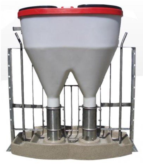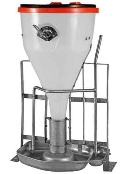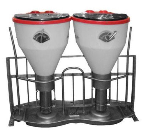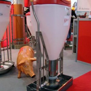 Хранилка за угоявани прасета с кръгло корито от полимер бетон. Рамка от неръждаема стомана. Предназначенa за угоявани прасета от 30 до 120 kg. Една хранилка може да се ползва за до 50 прасета. Може да се монтира в бокса, или на стената между боксовете. Капацитет на тубуса 80 kg. Цилиндричната форма на тубуса и бъркалката в него не позволяват засводяване на фуража. Бъркалката в тубуса осигурява равномерно разпределение на фуража в коритото. Система за поене с два нипела, разположени в самото корито. Регулатор за притока на фураж в коритото.