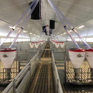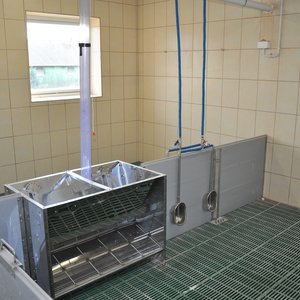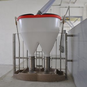 Предназначенa за отбити прасета от 7 до 45 kg. Една хранилка може да се ползва за до 50 прасета. Може да се монтира както в бокса, така и на стената между боксовете. Капацитет на тубуса 80 kg. Специалната форма на тубуса и бъркалката в него не позволяват засводяване на фуража. Тубусът има капак, предотвратяващ разпрашаването на фуража. Капакът има два отвора за захранващи тръби. Система за поене с два нипела на хранилка. Единият нипел е в коритото за хранене, а другият – в отделно корито за поене. Регулатор за притока на фураж с 10 позиции. Удобно корито от неръждаема стомана. Рамка от неръждаеема стомана (предлагат се и с поцинкована рамка).